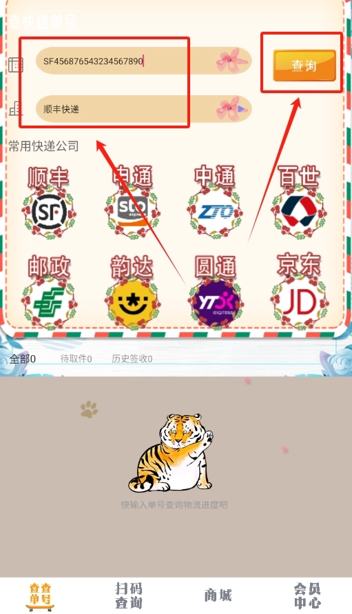 3、支持手动输入单号或扫描条形码查询物流,查单时无需输入验证码,也不必手动选择快递公司。