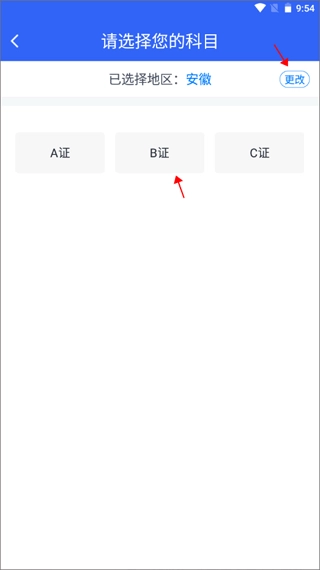 2、若需要修改之前选定的科目与考试地点,可先点击页面右上方的“更改”按钮,随后重新选择科目。