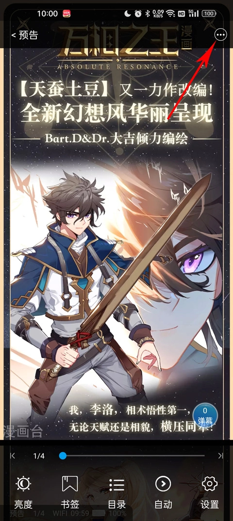 3、进入动漫之后,点击屏幕的正中间会出现亮度、书签、目录、自动、设置等功能;