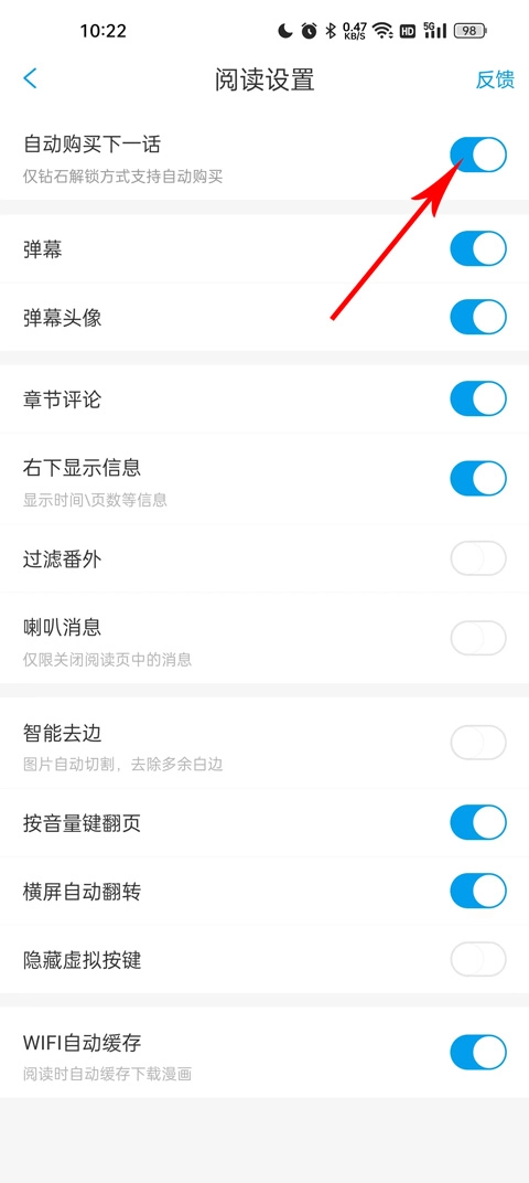 4、在阅读设置中,将自动购买下一话进行关闭,就可以取消自动续费功能了。