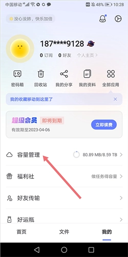 新用户都可获得100GB的永久有效的免费空间,用户可以进入应用的【我的】页面中点击【容量管理】