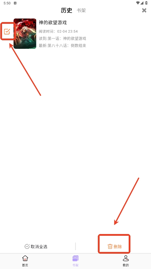 勾选漫画点击删除。