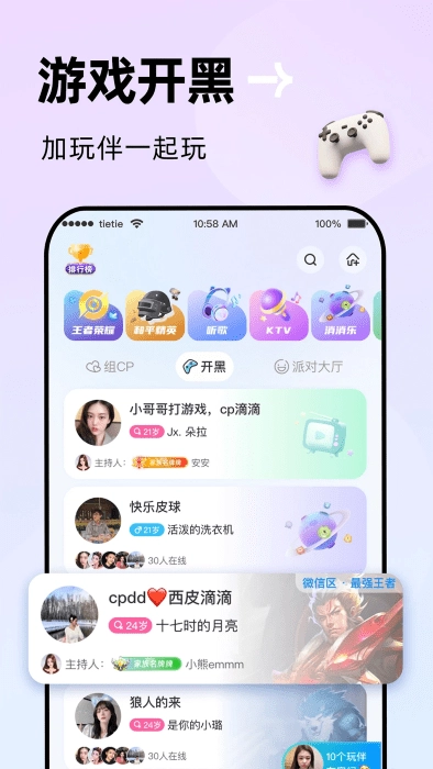 贴贴软件是天津又闲网络科技有限公司推出的开黑聊天应用,你可以和心仪的伙伴组队开黑,它是游戏陪伴的必备工具,支持语音聊天功能,让你告别独自游戏的时光,组队、聊天、玩游戏一站式体验,快来看看吧!