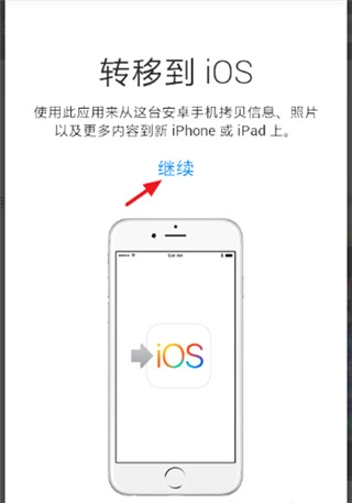 4、安装完成后,打开转移到iOS,点击【继续】。