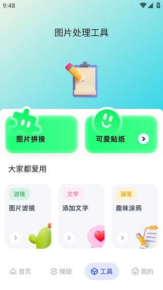 图片处理,拥有强大的照片编辑功能,无论是图片拼接、可爱贴纸、图片滤镜,还是添加文字、趣味涂鸦等,它都能轻松美化你的图片。