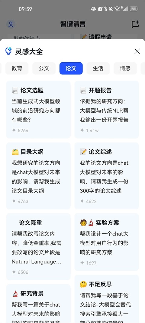 1、创新新增“灵感大全”模块,内含300多个场景的需求模板,涵盖文案创作、职场必备、生活创意、虚拟对话、代码指令等垂直领域的常见生产需求,助力用户快速入门。