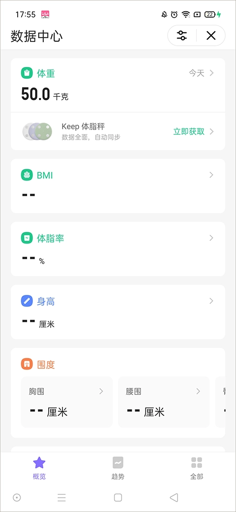3、先设置好个人身体数据信息,然后找到BMI及体脂率相关功能入口,就能查看系统自动计算得出的体脂率结果了。
