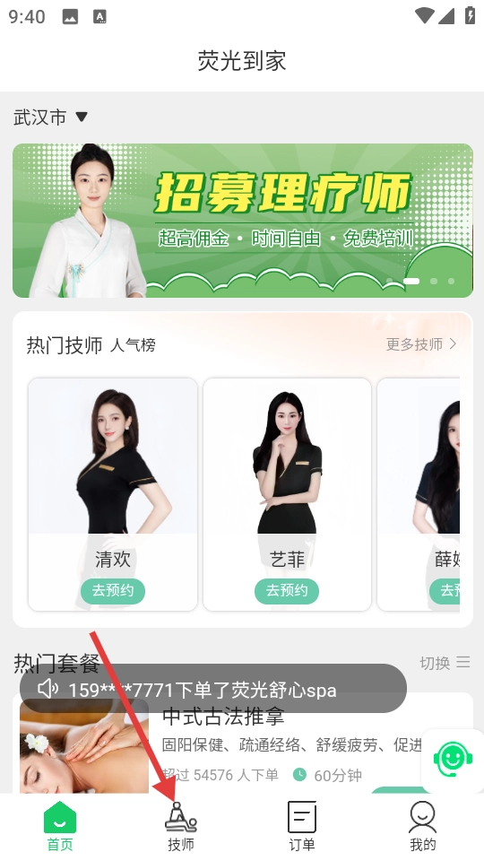 1、打开应用,点击页面下方的【技师】按钮。