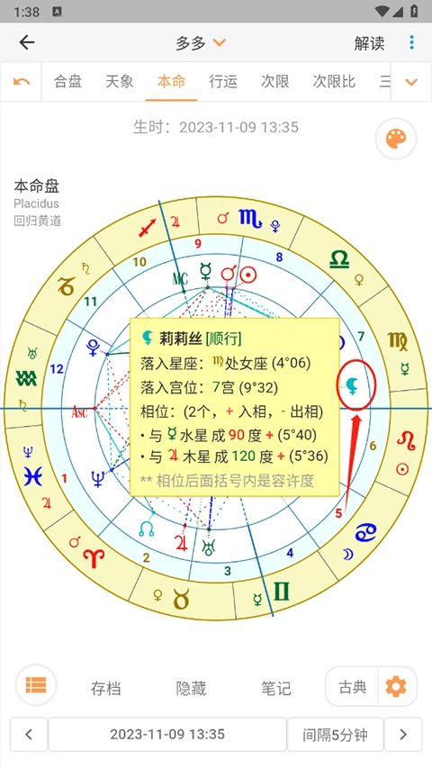 4、全面支持各类古典占星参数:涵盖先天禀赋、后天状态、宫位与星曜的对应关系、星体得时或失时的状态、运行速度、东出西入的方位特征、灼伤情况、喜乐位置、星体间的互容接纳关系、赤纬平行现象、映点与反映点、特殊度数标记、光线围攻格局、光线传送机制等。