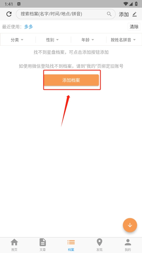 1、打开后,首先档案界面上点击添加档案