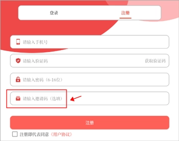 2、进入界面后,点击“注册”按钮,就能在密码输入框的下方填写邀请码了。