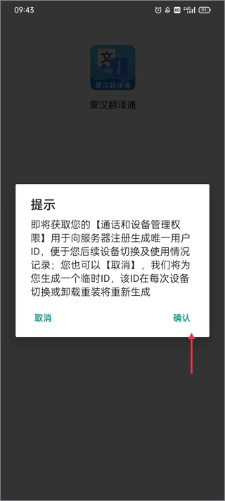 2、页面会弹出一个提示窗口,在了解其中的基本信息后,点击窗口下方的“确认”按钮。完成这一步操作后,你会看到软件的各个功能模块都显示为中文;要是你想将界面语言切换成蒙古文,可以进入【我的】页面,通过设置功能重新进行语言配置,这样就能切换到蒙古文界面了。