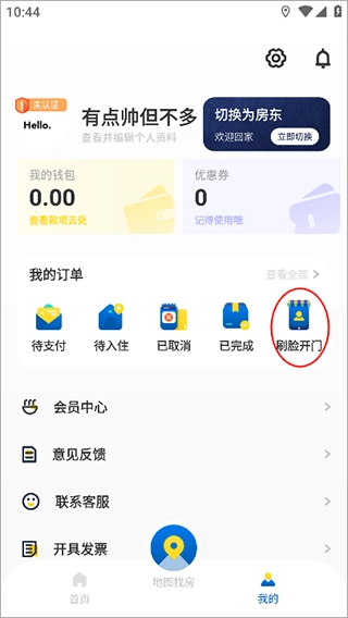 4、抵达房源所在位置后,可点击“我的”,在“我的订单”里选择“刷脸开门”选项,即可完成入住。