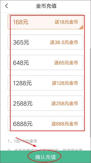 3、打开金币充值界面,选定要充值的金额后,点击【确认充值】按钮就可以完成操作。