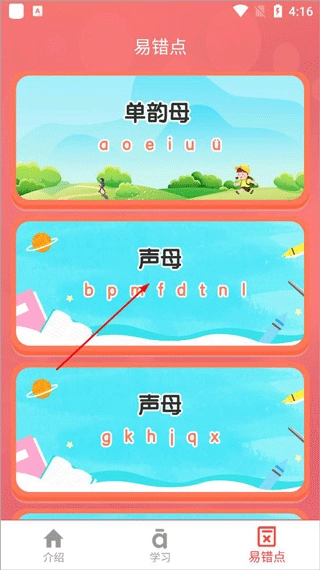 1、打开“小学生学拼音”,可以看到介绍、学习和易错点这几个版块,其中介绍版块的内容主要围绕汉语拼音学习展开。