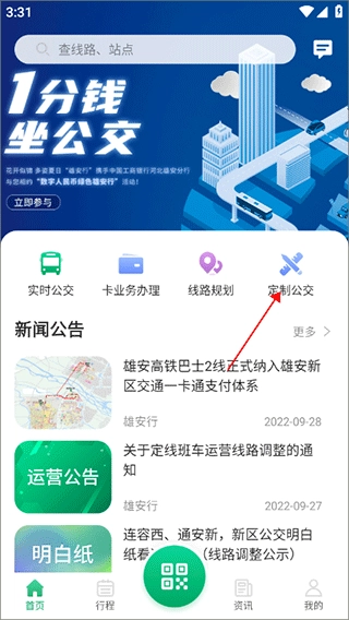 1、打开雄安行,在首页页面中,点击“定制公交”