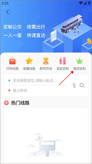 2、在弹出的新页面里,填写好出发地与目的地,接着点击“发起定制”按钮。