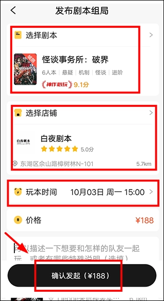 4、选好剧本,店铺,时间后,点击【确认发起】即可。