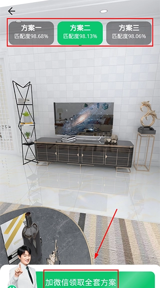 4、马上就能看到系统为你生成的3套3D装修全景方案,要是你觉得满意,还可以添加微信和工作人员进一步沟通。