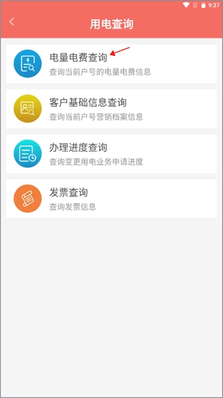 2、你也可以点击【用电查询】功能,选择电量电费查询选项。