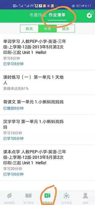 4、小朋友完成作业后,家长再打开布置作业的界面,接着点击上方的作业清单,就能查看孩子的完成情况了。