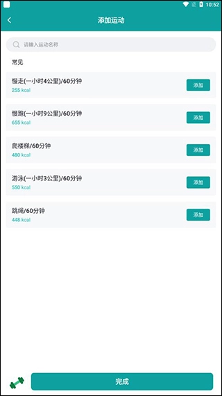 【运动消耗统计】记录各类运动项目及其时长,核算所消耗的卡路里数值并给出相应分析。