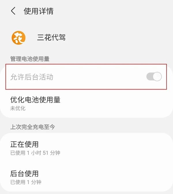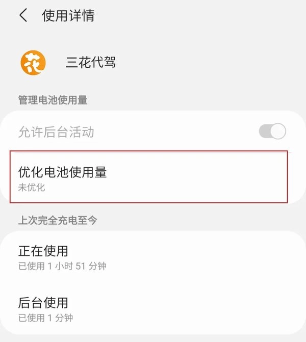 9、优化电池使用量时,找到三花代驾,点击【关闭按钮】,具体操作可参考下图: