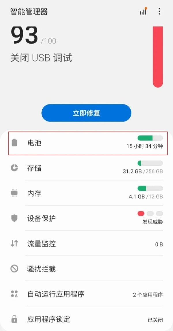1、打开手机的【智能管理器】应用,接着点击其中的【电池】选项,操作示意图如下: