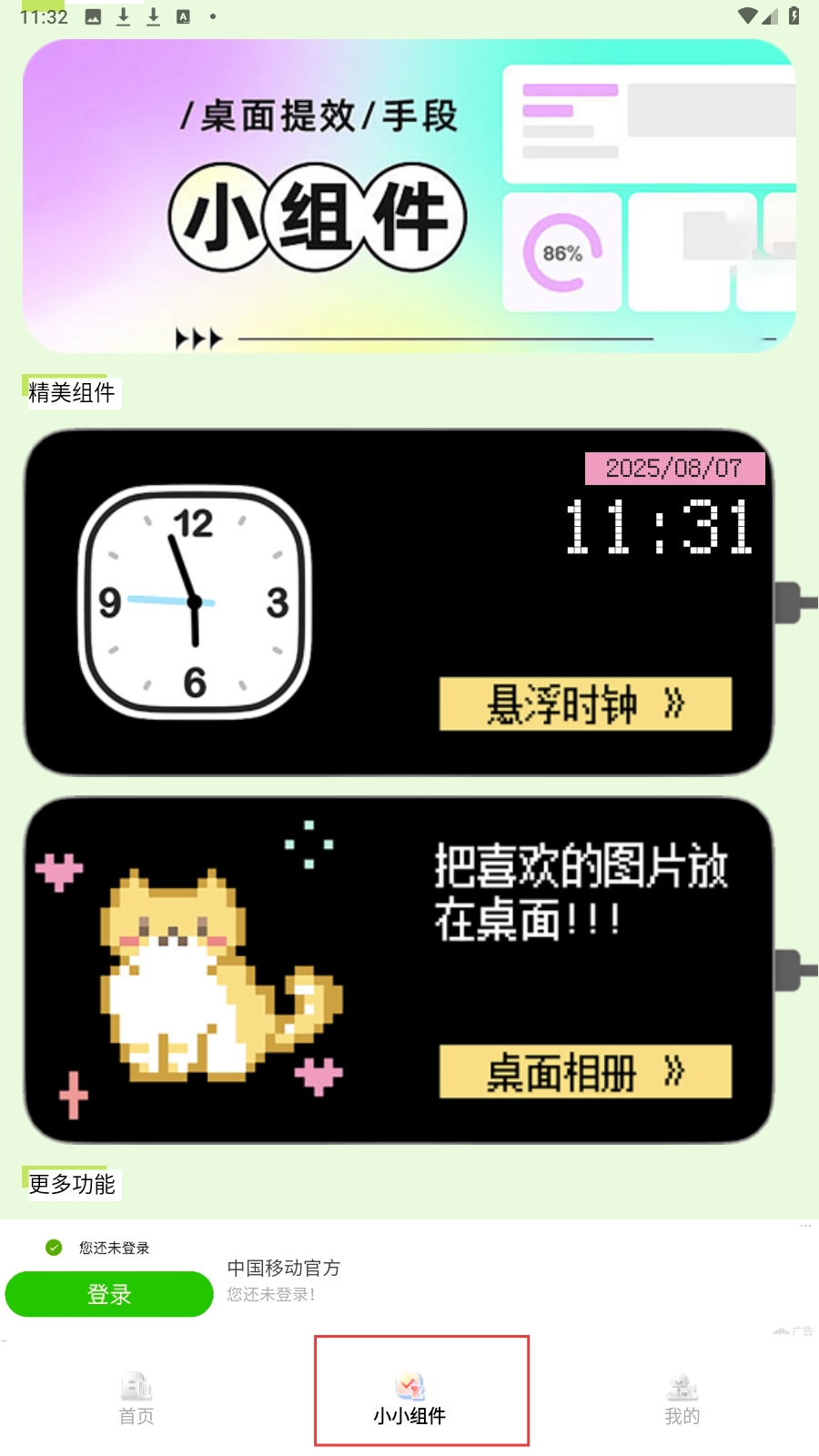4、进入【小小组件】板块,有【悬浮时钟】【桌面相册】等组件可添加使用。
