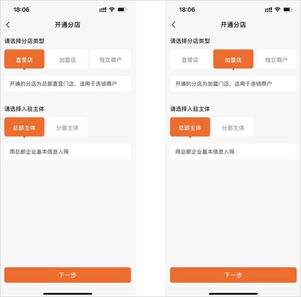 Tips:分店类型包含三种,当选择独立商户这一类型时,入网主体需为独立主体,和已有的商户不存在关联;若选择另外两种分店类型,则既可以选用总部主体企业的信息进行入网,也可以选用分店自身主体企业的信息来入网。