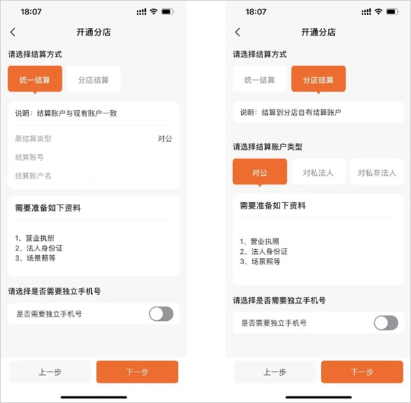 分店结算方式包含统一结算与分店结算两种类型。只有当总店采用对公结算方式时,才具备选择统一结算的条件;而分店结算则能够将款项结算至分店的对公账户、对私法人账户以及对私非法人账户。