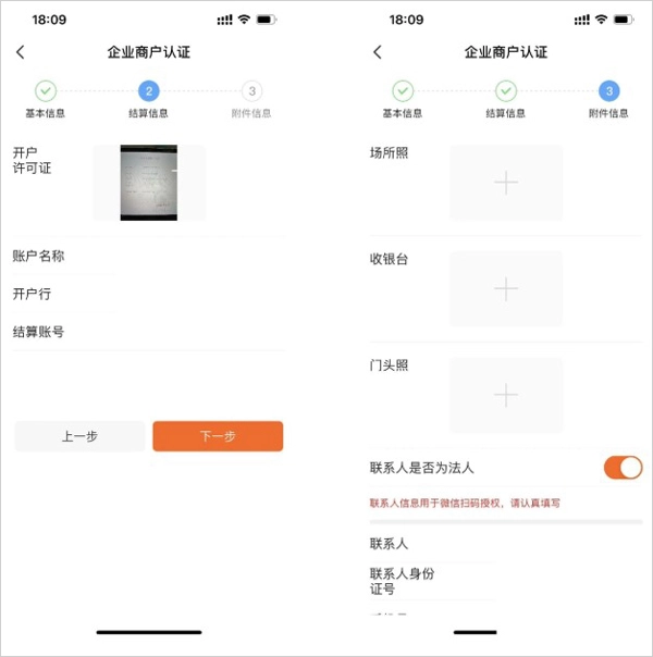 注意:营业场所照片不得与总店相同,不然会造成入网失败;若分店微信、支付宝的实名认证主体不是法人,可填写认证联系信息,由指定联系人完成认证。