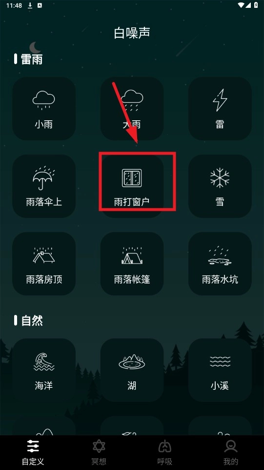 1、打开软件后,点击选择所需功能,例如白噪声、雨打窗户声。