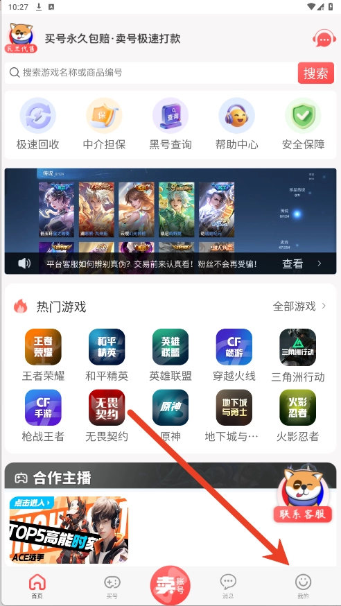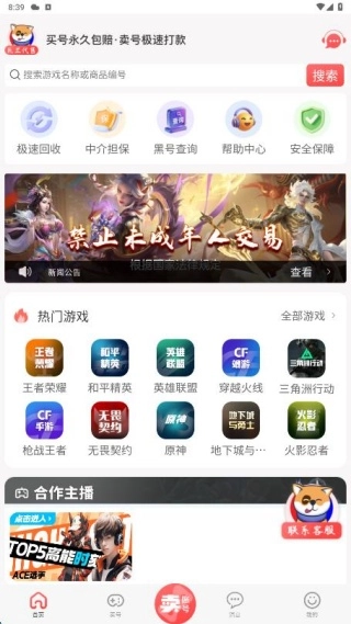 1、首页为我们推荐了热门游戏账号与合作主播的相关信息,同时还能看到急速回收、中介担保等功能的展示。