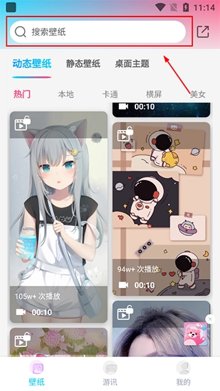 1、打开元壁纸软件,利用顶部的搜索栏输入关键词,就能快速找到自己喜欢的壁纸;