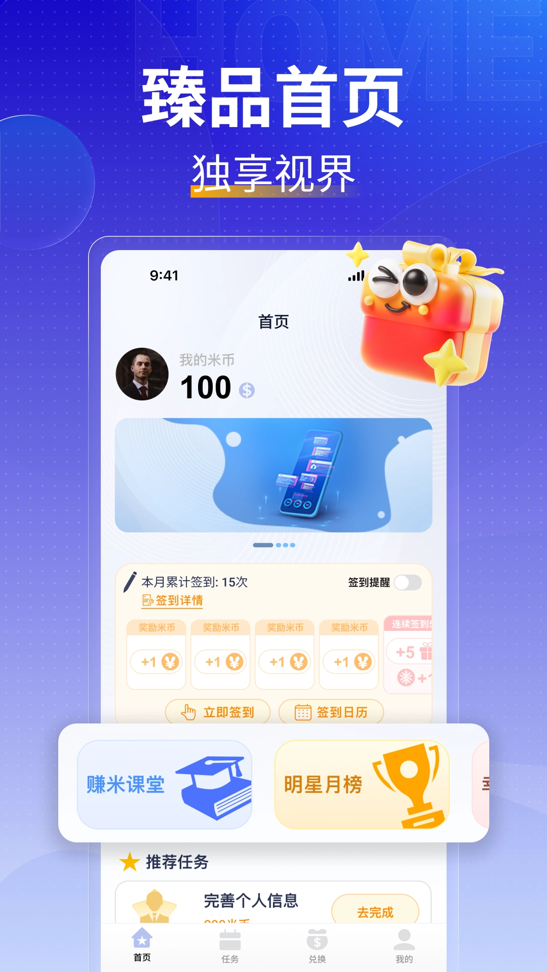 米多薪是一个能让你轻松获取奖励的平台,这里有各种各样的任务可供选择。当你完成这些任务后,就能得到米币,用它可以兑换琳琅满目的礼品。平台上的礼品种类十分丰富,能够满足大家不同的兑换需求,让你在闲暇时间里轻松享受,不用花一分钱就能把心仪的礼品带回家。