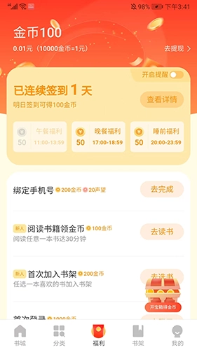 8、打开福利页面,完成签到、阅读、登录等任务就能得到金币奖励,攒够一定数量的金币后还能申请提现。