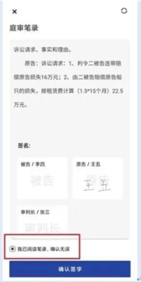 庭审结束后,法官会发起笔录签名流程,当事人需核对笔录内容,确认无误后勾选“我已阅读笔录,确认无误”,并在指定空白处签字,随后点击“确认签字”按钮,至此完成相关操作,等待庭审正式结束。