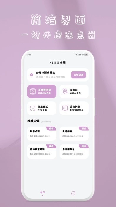 快指点击器是一款能帮用户智能点击手机屏幕的应用工具,它具备多项实用的强大功能,用户可依据自身需求轻松设置点击间隔次数、频率、手势等,能助力你快速抢到所需车票和优惠券等,让双手彻底解放,十分便捷高效,有需要的朋友赶紧来体验吧。