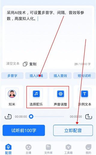 4、完成选择后,可对背景音乐和声音间距进行设置,随后点击“立即配音”按钮即可