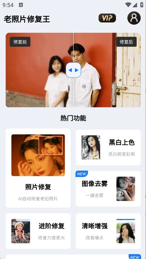 1、用户可在老照片修复王首页挑选所需功能来处理图片。当前支持的功能包含:照片修复、照片风格转换、照片动漫化、图片无损放大、图片拉伸修复、合照修复、黑白图片上色、图像去雾、图像清晰度增强、对比度增强、人像美颜、人像瘦脸。