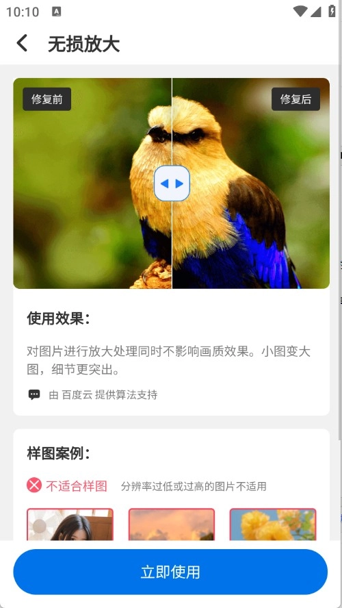 上传一张图片,系统能够在尽可能维持图像原有质量的前提下,把图像的长和宽各自放大至原来的两倍。
