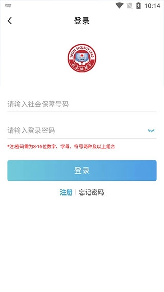2、输入社保卡号码(通常为身份证号码)和登录密码。若为首次使用,可点击注册,通过人脸识别来设置密码。