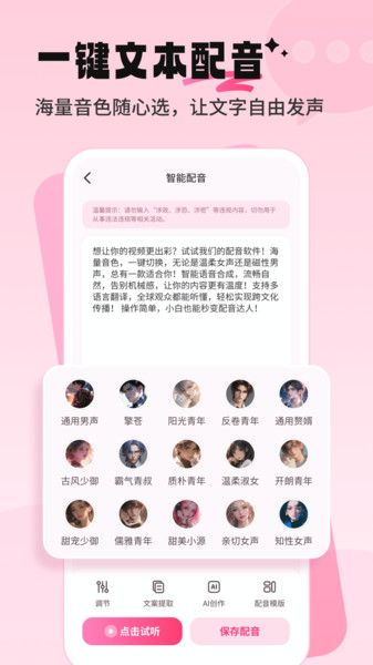 配音酱是一款使用便捷的配音工具,它为用户提供了丰富多样的配音音质选择,用户可以根据自身需求挑选合适的音质,轻松完成文案配音工作。此外,软件支持一键文本转配音功能,能帮助用户快速搞定配音任务。有需要的用户快来体验吧。