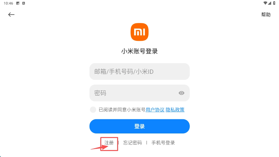 3、在登录页面,点击注册选项,进入注册小米账号页面。