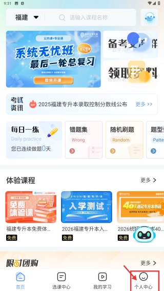 1、打开学习类,点击底部个人中心选项,进入个人中心页面。