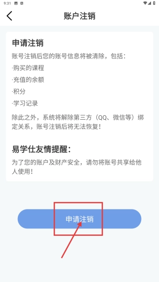 4、确认注销说明后,点击申请注销按钮,提交账号注销申请。