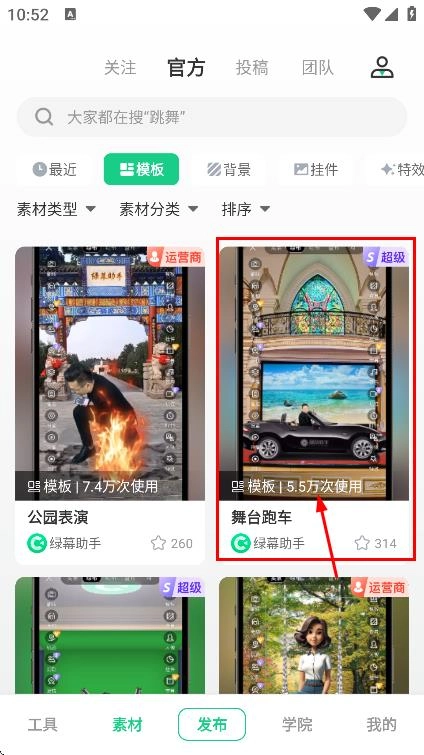 2、在素材页面,点击模板,进入模板选择页面。