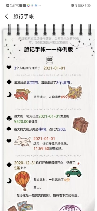 3、在旅行手账页面,你可以查看具体的手账样例信息,从而更直观地了解自己的手账内容。