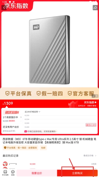 4、在商品详情页,点击立即购买按钮,进行移动硬盘购买操作。